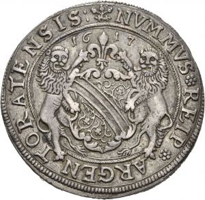 Vorderseite: NVMMVS REIP ARGEN-TORATENSIS. Zwei Löwen halten Stadtwappen. Darüber eine Lilie zwischen Jahreszahl 16-17.