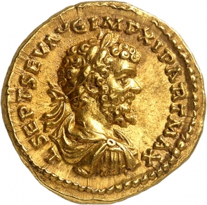 Literatur: K. Regling, Römische aurei aus dem Funde von Karnak in: Festschrift zu Otto Hirschfelds sechzigstem Geburtstage (1903) 286 ff. 288 Nr. 10 (dieses Stück). Vgl. RIC IV-1 Nr. 130 (dort Kopf, nicht Büste, nach r., 198-200 n. Chr.).