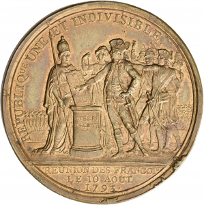 Vorderseite: REPUBLIQUE UNE - ET INDIVISIBLE // REUNION DES FRANCOIS / LE 10 AOUT / 1793 [UE nach REPUBLIQ und S nach FRANCOI hochgestellt]. Vor einem Altar mit Aufschrift LIBERT / ÉGALITE steht rechts ein Mann in Uniform und legt seine rechte Hand zum schwur auf eine von Minerva/Francia mit Speer gehaltene Verfassungstafel mit dem allsehenden Auge und angedeuteter Schrift. Dahinter steht Justitia mit Waage in der rechten Hand sowie vier Männer mit zum Schwur erhobenen Händen. Im Hintergrund eine Menschenmenge.