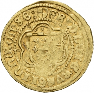 Vorderseite: FRID DEI G BURGI IN NUREMBG [UR jeweils ligiert]. Schild Burggrafschaft Nürnberg im Sechspass, in den Außenwinkeln des Sechspasses Ringel, um den Schild drei Ringel. Am Umschriftbeginn Zollernschildchen.