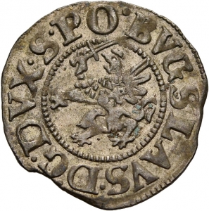 Vorderseite: BVGSLAVS D G DVX S PO. Der bekrönte pommersche Greif nach links, im erhobenen rechten Vorderfang ein Schwert haltend.
