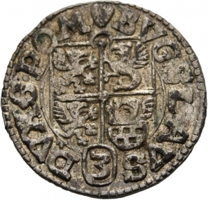 Vorderseite: BVGSLAVS - DVX S POM. Gevierter pommerscher Wappenschild (Pommern, Rügenwalde, Barth, Wolgast), darunter die Wertzahl 3. Am Ende der Umschrift ein Herz.