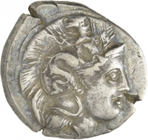 Vorderseite: Kopf der Athena mit attischem Helm nach r. Skylla mit Dreizack nach r. auf dem Helmkessel.