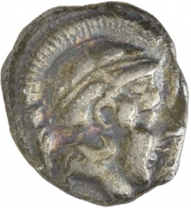 Vorderseite: Kopf der Athena mit attischem Helm nach r. Lorbeerkranz auf dem Helmkessel.