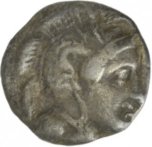 Vorderseite: Kopf der Athena mit attischem Helm nach r. Skylla mit Dreizack nach r. auf dem Helmkessel.