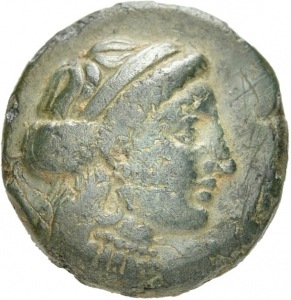 Vorderseite: Weiblicher Kopf (Hera?) mit Diadem, Ohrring und Halskette nach r.