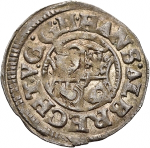 Vorderseite: HANS ALBRECHT V G G H. Der gevierte mecklenburgische Wappenschild (Mecklenburg, Rostock, Stargard, Werle) belegt mit einem Herzschild (Schwerin).