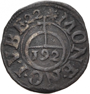 Vorderseite: MONE NO LVBEC 22. Reichsapfel mit Wertzahl 192. Am Beginn der Umschrift das Münzmeisterzeichen Stern (Heinrich von der Klähren).