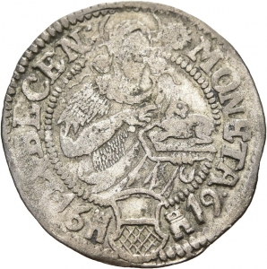 Vorderseite: MONETA - LVBECEN. Johannes der Täufer mit Lamm, darunter das Stadtwappen. In der Umschrift zu beiden Seiten des Wappens die geteilte Jahreszahl 16-19 sowie je ein Bürgermeisterzeichen Turm (Alexander Lüneburg). Zu Beginn der Umschrift das Münzmeisterzeichen Sonne (Heinrich von der Klähren).