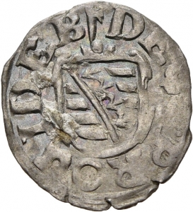 Vorderseite: DE[US] PROUIDEB. Das herzoglich-sächsische Wappen in Kartusche. Am Ende der Umschrift ein Zainhaken.
