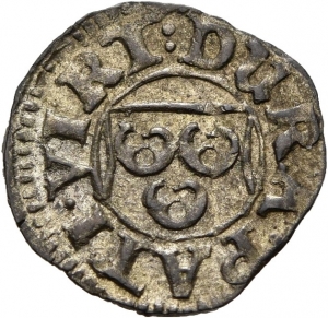Obverse: DURA PATI VIRT. Das Wappen der Grafschaft Brehna.