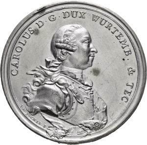 Literatur: Zur Vs.: U. Klein - A. Raff, Die Württembergischen Medaillen I (1995) 297 Stempel Nr. 2. Zur Rs.: Chr. Binder, Württembergische Münz- und Medaillenkunde (1846) 246 Nr. 311; Chr. Binder, Württembergische Münz- und Medaillen-Kunde. Hrsg. von J. Ebner (1910) 221 Nr. 378; U. Klein - A. Raff, Die Württembergischen Medaillen I (1995) 349-350 Nr. 292 a (datiert ab 1775).