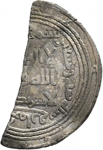 Vorderseite: Bismill[āh ḍuriba hāḏā ad-dirham bi-]Kirmān fī sana sitt wa tisʿīn -/ Lā ilāh [ʾillā] / Allāh wa[ḥdahū] / lā šarīk [lahū] [Im Namen Gottes, dieser Dirham wurde geschlagen in al-Furāt im Jahr sechs und neunzig Es gibt keinen Gott außer Gott, er ist einzig, er hat keinen Begleiter]. Umlaufend Nennung von Nominal, Münzstätte und Prägejahr. Im Feld das Glaubensbekenntnis. Als Randzier 5x o auf drei Zackenkreisen. Prägejahr 96 AH.