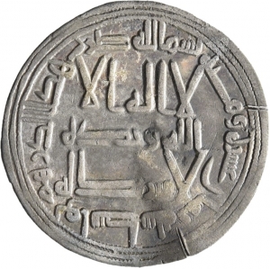 Vorderseite: Bismillāh ḍuriba hāḏā ad-dirham bi-Wāsiṭ sanat ṯamānu ʿašra wa-miʾa -/ Lā ilāh ʾillā / Allāh waḥdahū / lā šarīk lahū [Im Namen Gottes, dieser Dirham wurde geschlagen in Wāsiṭ (im) Jahr acht zehn und hundert Es gibt keinen Gott außer Gott, er ist einzig, er hat keinen Begleiter]. Umlaufend Nennung von Nominal, Münzstätte und Prägejahr. Im Feld das Glaubensbekenntnis. Als Randzier wohl 3x ⓪ auf drei gezackten Kreisen. Prägejahr 118 AH.