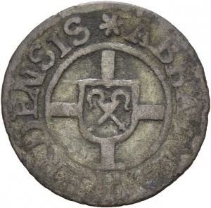 Obverse: ABBATIAE WERDENSIS [AE ligiert]. Auf einem Kreuz ein Wappenschild, darin zwei gekreuzte Krummstäbe. Am Ende der Umschrift eine sechsblättrige Rosette.