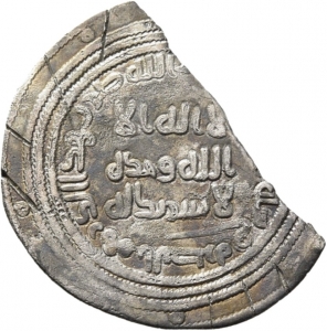 Fragment einer Münze, von der die Jahreszahl abgetrennt ist. Da in der umlaufenden Aufschrift auf der Vorderseite das Wort fī (in) enthalten ist, kommen nur 81 und 82 AH als Prägejahr in Frage. Beidseitig sind Einhiebe erkennbar. Auf der Rückseite ist ein Zentrierpunkt zu sehen.