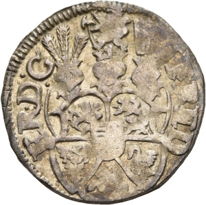 Obverse: FRED-ER D G. Das dreifach behelmte Wappen des Herzogtums Schleswig-Holstein-Gottorf (Herzschild Feld 1 und 4 Grafschaft Oldenburg, Feld 2 und 3 Herrschaft Delmenhorst, Feld 1 Königreich Norwegen, Feld 2 Herzogtum Schleswig, Feld 3 Herzogtum Holstein, Feld 4 Herrschaft Stormarn, Feld 5 Land Dithmarschen).