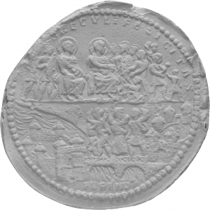 Gipsabguss des 1862 in der Saône in Lyon gefundenen einseitigen Bleiabschlags der Rückseite eines spätantiken Medaillons (Multiplum). Original seit 1870 im Besitz des Cabinet des Médailles in Paris unter der Inventarnummer K 520. Die Maße des Originals betragen 87x77 mm und die des Stempelabdrucks alleine 70 mm. Materialangabe hier nach dem Original. - Wie die handgeschriebene Notiz auf der Rückseite des Berliner Gipsabgusses mitteilt, wurde das Bleimedaillon vor seinem Verkauf nach Paris am 1. Juli 1864 von dem Münzhändler Vaganay zum Verkauf angeboten. Damit erhält dieser Berliner Gips, der das Original im Zustand kurz nach seiner Auffindung widergibt, angesichts der bereits bis 1870 fortgeschrittenen Verwitterung des Originals eine besondere Bedeutung und steht gleichrangig neben einem weiteren Abguss in Lyon [s. Turcan (1987) 183 Taf. 35 und Anm. 2].