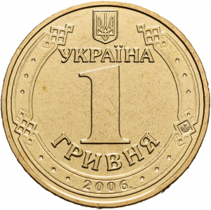 Vorderseite: Ukraine / 1 / Hrywnja [Kyrillisch]. Oben Landeswappen über Staats-, Wert- und Nominalbezeichnung. Rechts das Zeichen der Münzstätte Kiew.