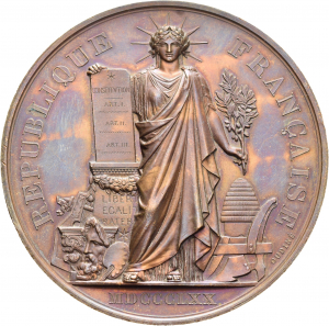 Vorderseite: REPUBLIQUE - FRANÇAISE // MDCCCLXX. Marianne steht mit Lorbeerkranz und Strahlenkranz frontal. Mit der linken Hand hält sie einen Ölzweig und mit der rechten Hand eine Tafel mit der Aufschrift CONSTITVTION / ART I / ART II / ART III auf einem Podest mit der Aufschrift LIBERT / EGALIT / FRATER. Am Boden links liegen Palette, Maske, Leier und ein Kapitell, rechts neben der Frau steht ein Bienenstock und ein Pflug. Unten rechts die Signatur OUDINÉ (Eugène-André Oudiné).