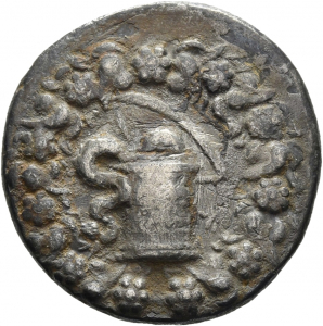 Vorderseite: Cista mystica mit halb geöffnetem Deckel, aus der sich eine Schlange herauswindet. Gerahmt von Efeukranz.