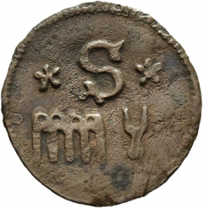 Obverse: S zwischen zwei Sternchen. Darunter Kamm (Zeichen der Linie Schwarzburg-Rudolstadt) sowie Schlackegabel nach oben (Zeichen der Linie Schwarzburg-Sondershausen).