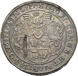 Vorderseite: SIMON COMES ET NOBILIS DOMINVS IN LIPP. Das behelmte Wappen der Grafschaft Lippe samt Helmdecken und Helmzier (Feld 1 und 4 Lippe, 2 und 3 Schwalenberg).