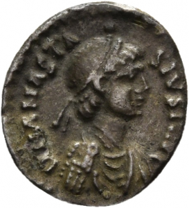 Vorderseite: D N ANASTA-SIVS P AVG. Drapierte Panzerbüste des Anastasius mit Diadem nach rechts.