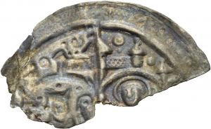 Der Brakteat wurde hälftig positiv und hälftig negativ geprägt. Die eine Hälfte erscheint erhaben und die andere vertieft. Fragment des oberen Drittels der Münze.