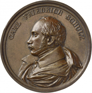 Vorderseite: CARL FRIEDRICH SCHULZ. Das Brustbild des Carl Friedrich Schulz im Mantel nach links.