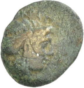 Vorderseite: [ΔΑΜΟ]ΚΡΑΤΙΑ[Σ]. Weiblicher Kopf (Aphrodite?) mit Haarband (sphendone) nach r.