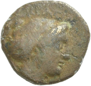 Vorderseite: [ΔΑΜΟ]ΚΡΑΤΙΑ[Σ]. Weiblicher Kopf (Aphrodite?) mit Haarband (sphendone) nach r.