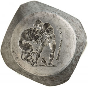Oberstempel. Stempelhöhe ca. 112,6 mm, maximaler Durchmesser 40 mm, Durchmesser Stempelfläche 28,1 mm, Bildfeld 22 mm. Am Schaft die Zahl 56. Aufkleber am Stempelboden: P 5. Der Schlagbart am Stempelboden zeigt, dass der Stempel offensichtlich für zahlreiche Prägungen verwendet wurde. Zu diesem Oberstempel passt der Unterstempel Objektnummer 18300596.
