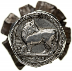 Literatur: M. Pinder, Die Beckerschen falschen Münzen (1843) Nr. 11; G. F. Hill, Becker the counterfeiter (1924 Nachdruck 1955) Nr. 11. Vgl. zur möglichen Vorlage: G. Libero Mangieri, Sibari Sirino e Pissunte, Rivista Italiana di Numismatica 83, 1981, 7 D 4 Taf. 2 (ca. 540-510 v. Chr.); N. K. Rutter, Historia Numorum. Italy (2001) 143 Nr. 1725 (Silber, Stater, ca. 540-510 v. Chr.).