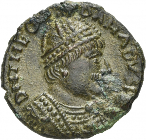 Vorderseite: D N THEO-DAHADVS REX. Drapierte Büste des Theodahat mit Spangenhelm in gotischer Tracht nach rechts.