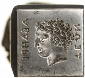 Vorderseite: ΑΒΔHPI/TEΩΝ. Kopf des Apollon mit Lorbeerkranz nach r. Ethikon l. und r. (wenn geprägt).