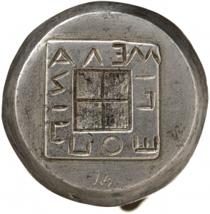 Vorderseite: EΠI MΕΛA-NΙΠ-ΠΟ. Erhabenes Linienquadrat, darum der Beamtenname. Alles in einem Quadratum incusum (wenn geprägt).