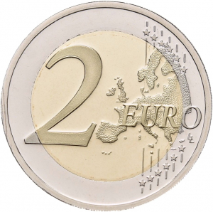 Vorderseite: 2 EURO. Karte der europäischen Union, zwölf Sterne auf dem Rand, Wertangabe. Am rechten Rand die Signatur LL (Luc Luycx).
