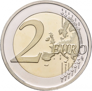 Vorderseite: 2 EURO. Karte der europäischen Union, zwölf Sterne auf dem Rand, Wertangabe. Am rechten Rand die Signatur LL (Luc Luycx).