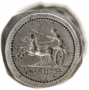 Vorderseite: ΦΙΛΙΠΠΟΥ. Zweigespann (biga) nach r. Der Lenker hält in der l. Hand die Zügel und hat in der r. Hand die Peitsche erhoben (wenn geprägt).