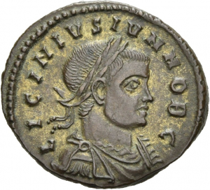 Vorderseite: LICINIVS IVN NOB C. Drapierte Panzerbüste des Licinus II. mit Lorbeerkranz in der Brustansicht nach r.