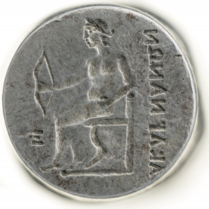 Vorderseite: AKAPNANΩN. Apollo Aktios sitzt auf Thron nach l., in der r. Hand einen Bogen haltend. Im r. F. ein Ξ (wenn geprägt).