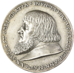 Literatur: Zum Original siehe: J. J. Spies, Der Brandenburgischen historischen Münzbelustigungen II (1769) 73-80; G. Habich, Die deutschen Schaumünzen des XVI. Jahrhunderts I-2 (1929) 143 Nr. 979 (Matthes Gebel zugeschrieben); J. Menadier, Schaumünzen des Hauses Hohenzollern (1901) 132 Nr. 520; G. F. Hill - G. Pollard, Renaissance medals from the Samuel H. Kress Collection at the National Gallery of Art (1967) 113 Nr. 596 c (Matthes Gebel zugeschrieben). Vgl. J. G. Pollard, National Gallery of Art, Washington. Renaissance Medals II. France, Germany, The Netherlands, and England (2007) 718 f. Nr. 718 (dort Blei, Matthias Gebel zugeschrieben). - Zum Fälscher siehe D. O. A. Klose, Der Fall Heinrich von Frauendorfer: Minister, Sammler und Fälscher in: C. Stoess - B. Weisser - B. Balz, Falschgeld und Münzfälschungen. Berliner Numismatische Forschungen Neue Folge 14 (2024) 89-107.