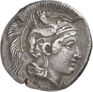 Vorderseite: Kopf der Athena mit attischem Helm nach r., auf dem Helmkessel ein Greif nach r.