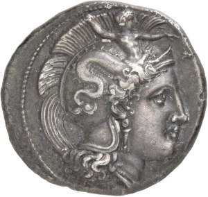 Vorderseite: Kopf der Athena mit attischem Helm nach r., auf dem Helmkessel Skylla nach r., die mit der r. Hand einen Stein wirft. Im r. F. die Buchstaben Δ [Κ Φ].