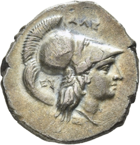 Vorderseite: Kopf der Athena mit korinthischem Helm nach r. Oben die Buchstaben AΛE, unter dem Helmkesel die Buchstaben EY. Unter dem Halsabschnitt der Buchstabe I mit langen Hasten.