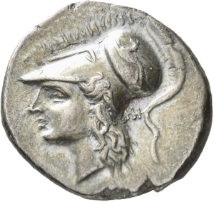 Vorderseite: ΗΡΑΚΛHIΩΝ. Kopf der Athena mit korinthischem Helm nach l. Auf dem Helmkessel ein Greif nach l. Unter dem Helmkessel die Buchstaben HH (ligiert).