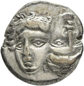 Vorderseite: Zwei jügendliche männliche Köpfe von vorn, der eine umgekehrt.