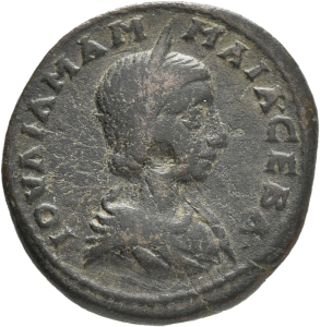 Vorderseite: IOVΛΙΑ ΜΑΜ-MAIA CEBA [sic!]. Drapierte Büste der Iulia Mamaea mit Diadem in der Brustansicht nach r.