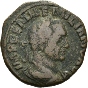 Vorderseite: IMP C EMIL EMILIANO AVG. Drapierte Panzerbüste des Aemilianus mit Lorbeerkranz in der Rückenansicht nach r.